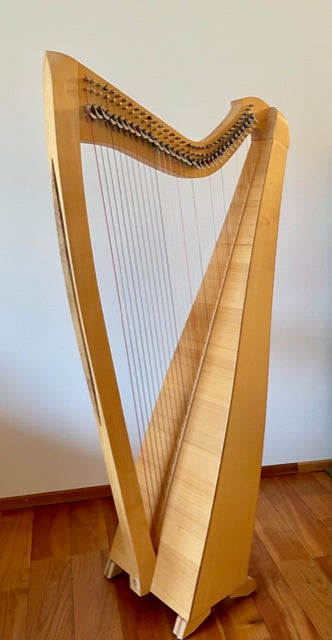 Ahornholz mit Verzierung aus Platanenholz. Gebaut von Schweizer Harfenbauer Durih Stuppan.