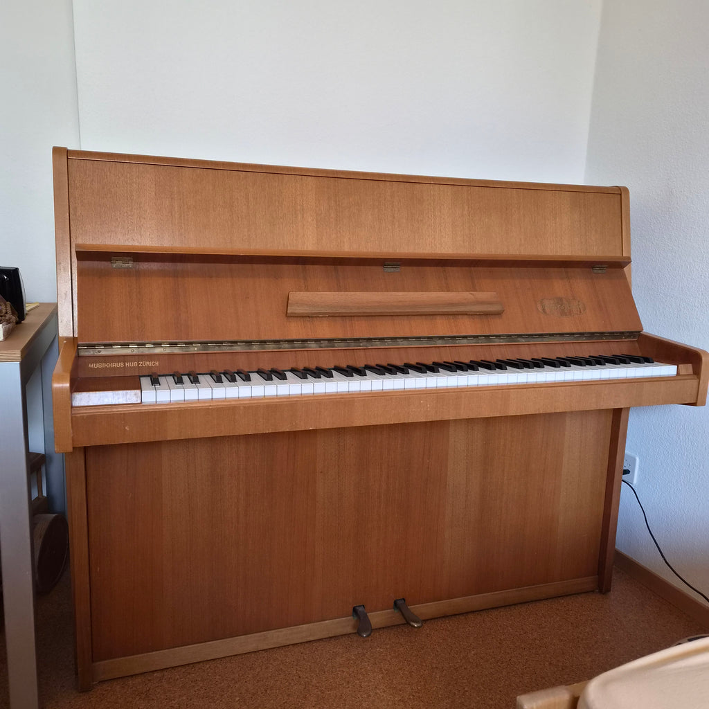 Beschreibung: Das Klavier Marke Burger & Jacobi Jahrgang 1967 aus Buchenholz in hellbrauner Farbe hatte mich während Jahrzehnten begleitet. Ich lernte darauf Klavier spielen und begleite mich bis heute beim Üben von Gesangsstücken. Das Klavier ist eher klein, handlich (Höhe 115 cm) und hat einen hellen, klaren Klang. Das Klavier wurde gut gewartet und regelmässig gestimmt. Die Tastatur ist einwandfrei, die Mechanik gut erhalten. Es stand 40 Jahre am selben Ort und nach dem Umzug nochmals gut 20 Jahre bei mir zuhause.